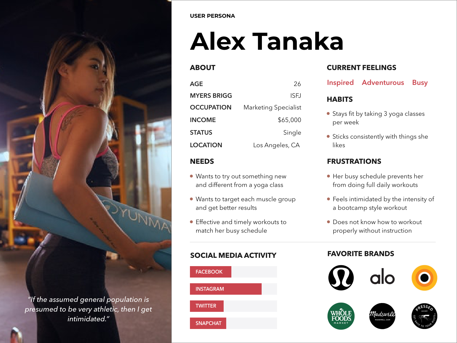 Our user Alex Tanaka is a 26 year old marketing specialist living in LA. She sticks consistently with things she likes. She was a member at Corepower Yoga but is looking to intensify her workout. She wants to see more results and really challenge herself.